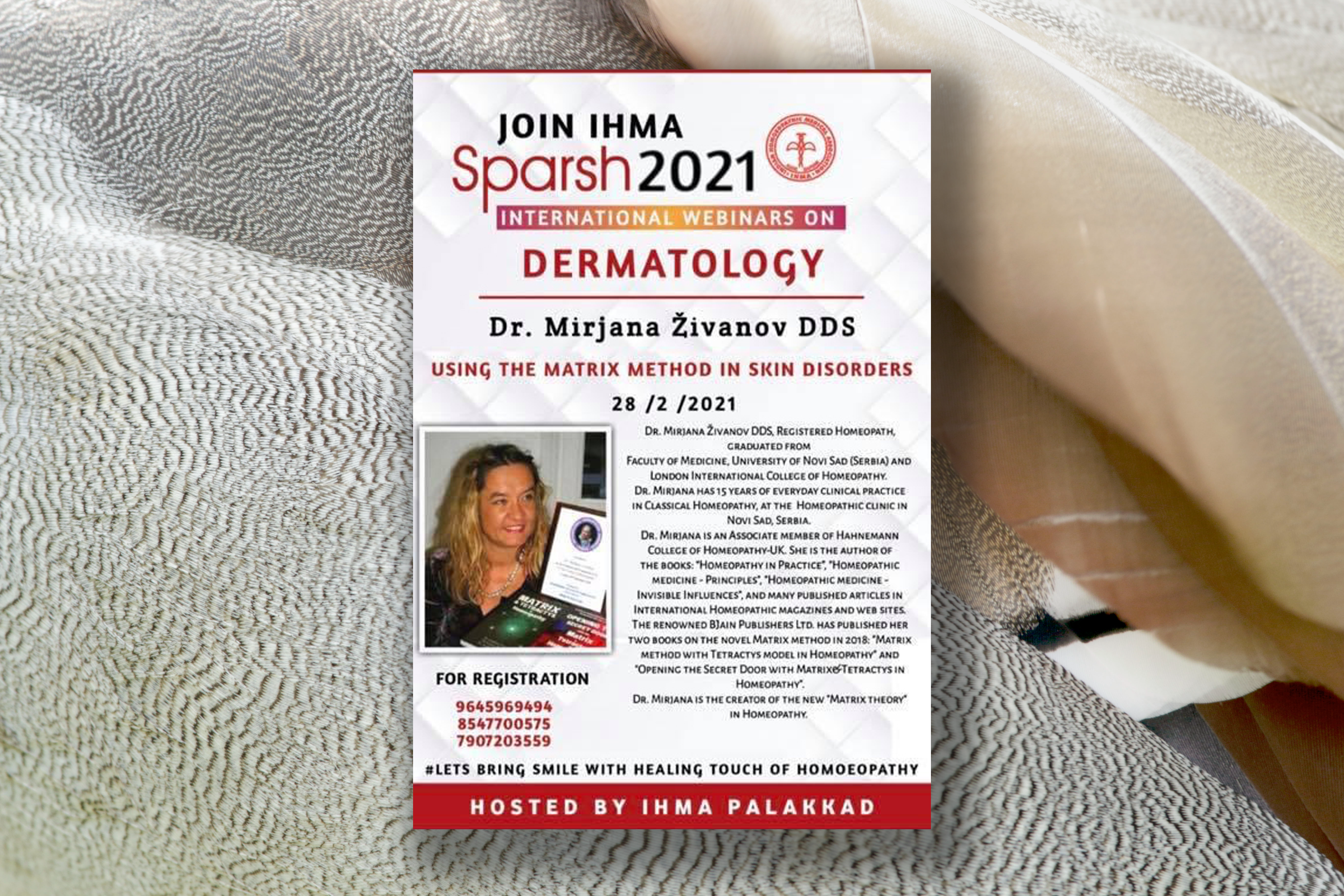 Zivanov, M. (2021) Using the Matrix Method for the Skin Diseases. presented at the Sparsh 2021 Dermatology Webinar of IHMA (Indian Homeopathic Medical Association), February 28th, 2021, India.